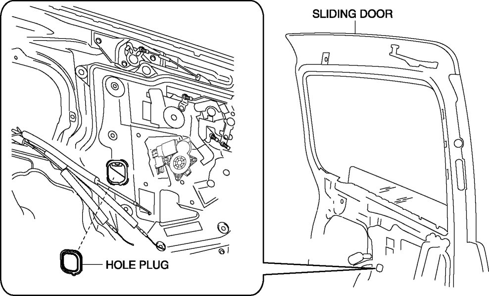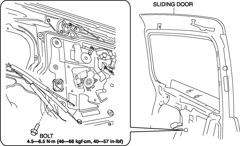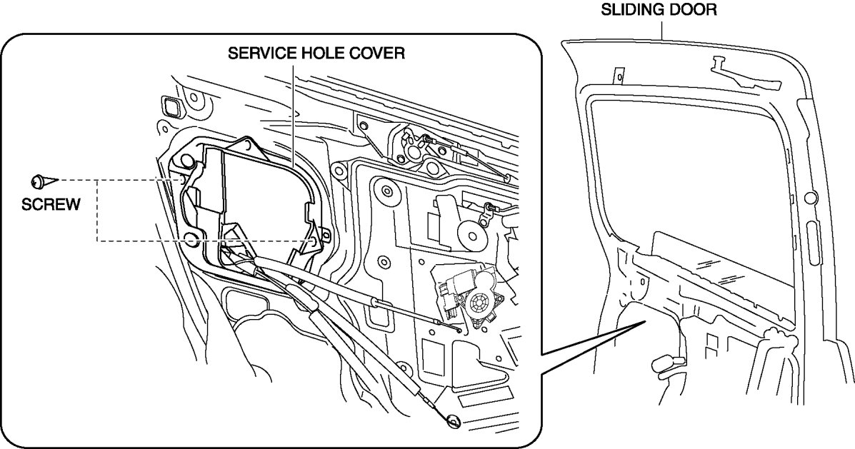 - If the bolts are removed without supporting the sliding door glass, the glass may fall off. Insert a hand through the service hole and lower the sliding door glass to the bottommost position while supporting the glass with your hand.