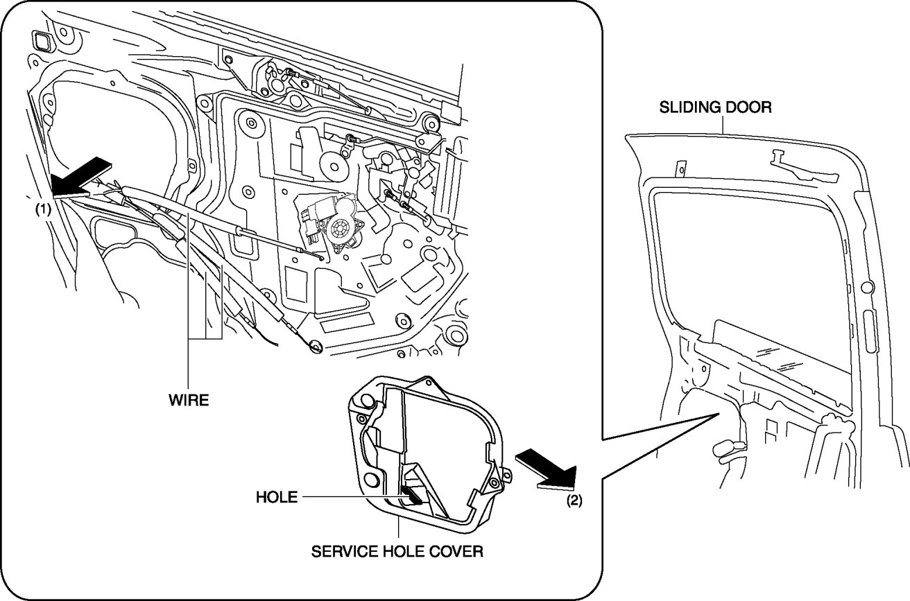 9. Remove the service hole cover in the direction of the arrow (1), then remove the service hole cover in the direction of the arrow (2) while avoiding the wires.