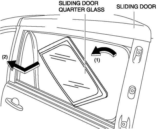 7. Tilt the sliding door quarter glass in the direction of arrow (1) shown in the figure and remove it in the direction of arrow (2).