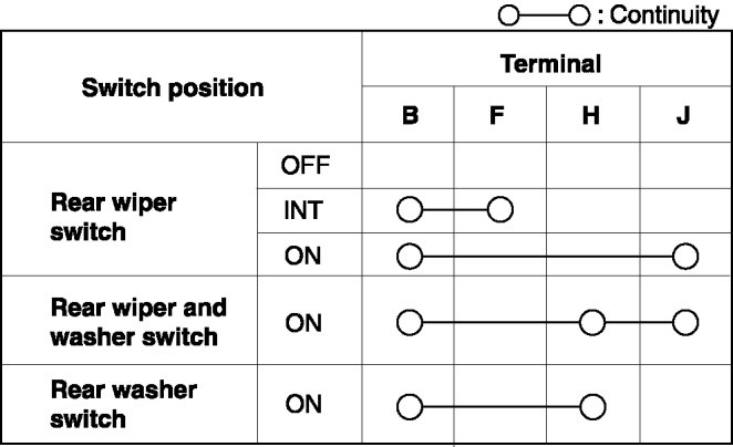 3. Verify that the continuity between the rear wiper and washer switch terminals is as indicated in the table.