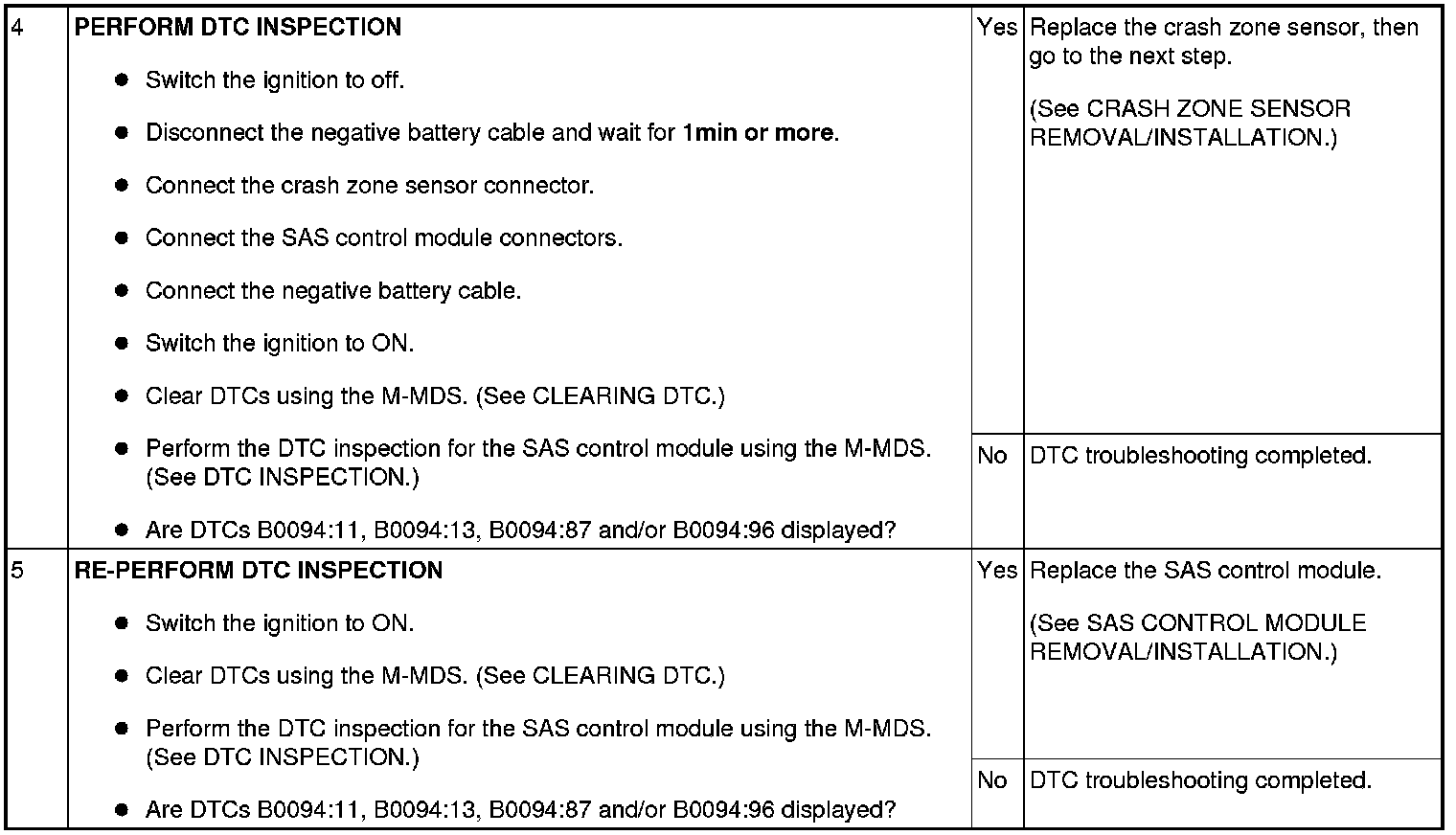 - Open or short circuit or short to ground or short to power supply in the wiring harness between the crash zone sensor and SAS control module