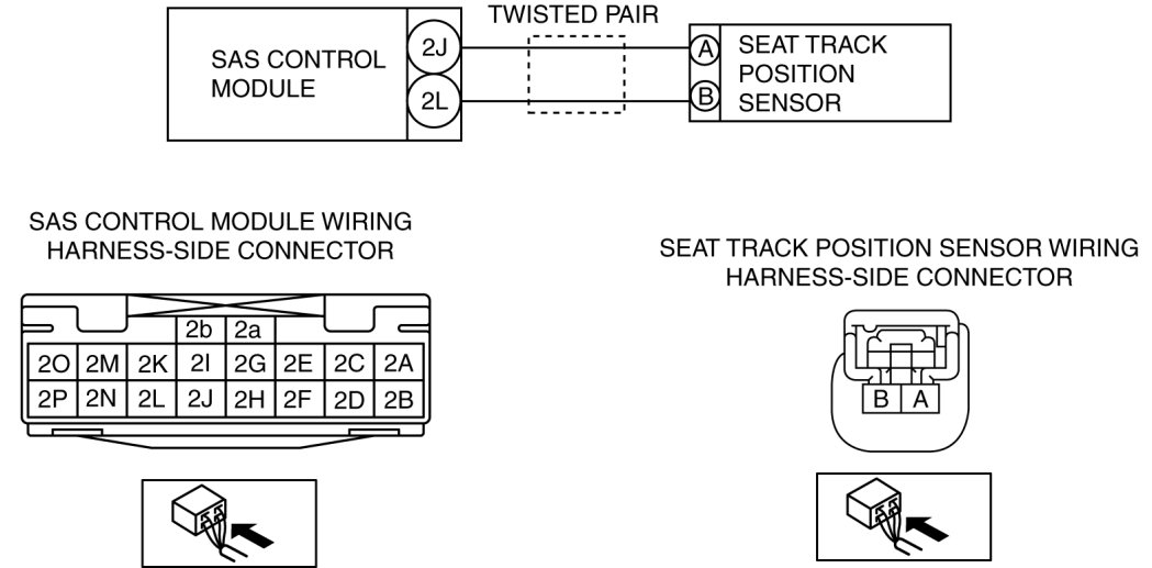 - Open or short circuit or short to ground or short to power supply in wiring harness between seat track position sensor and SAS control module