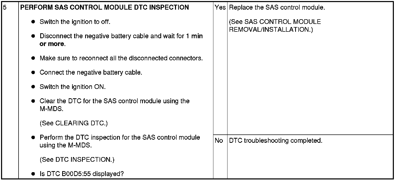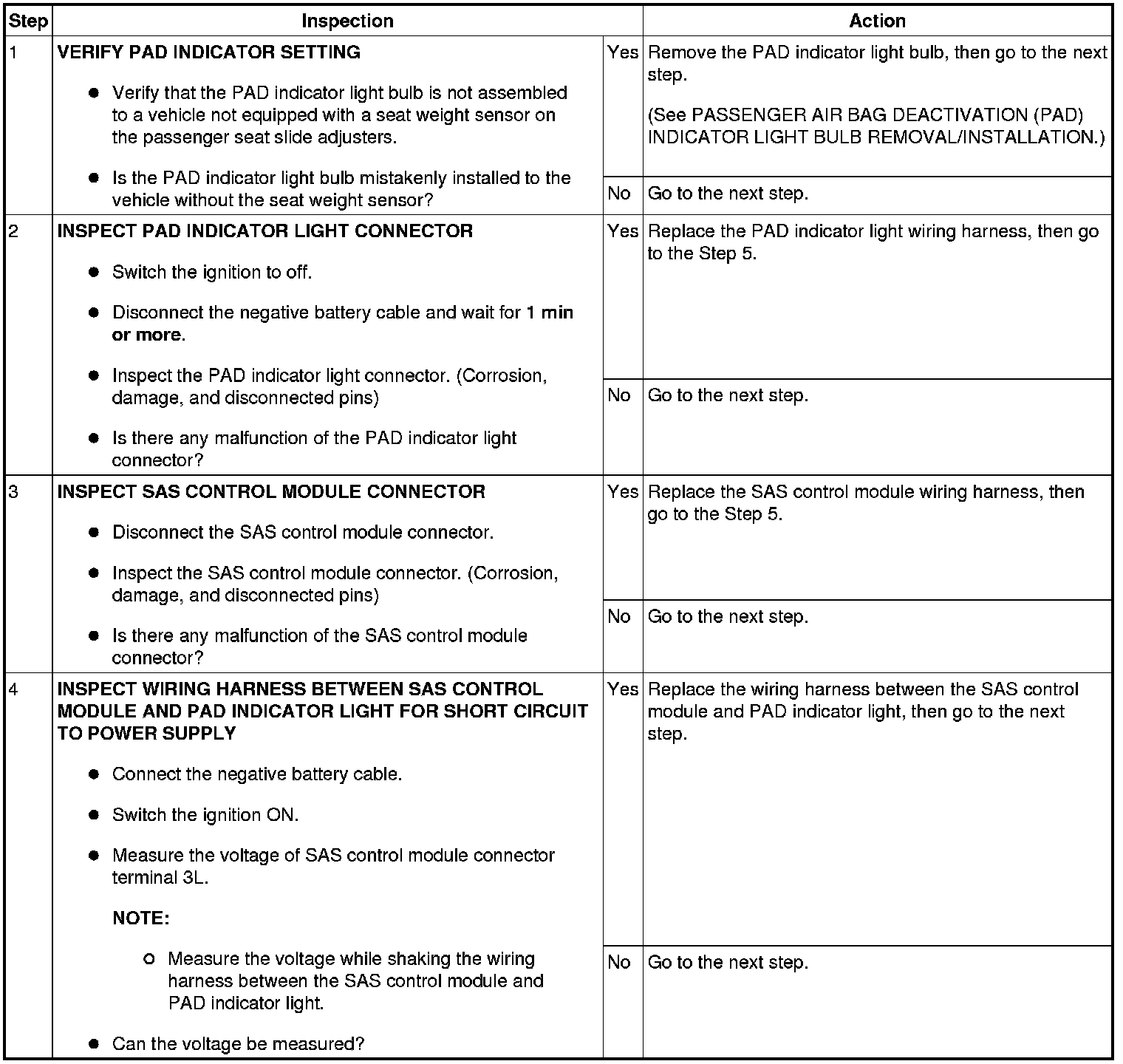 - Voltage of SAS control module terminal 3L (PAD indicator light output) is specification or more with the configuration setting for the SAS control module having no PAD indicator light