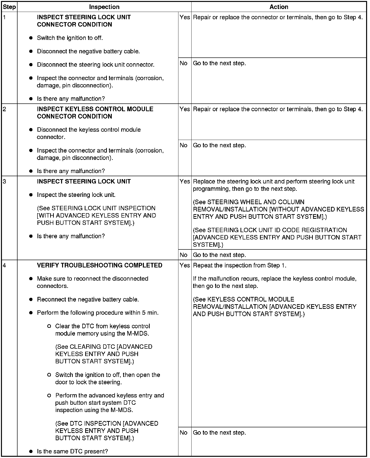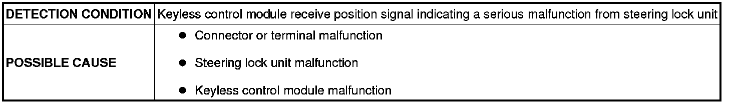 - If this DTC is detected, the system will enter the fail-safe function to ensure safety. If the vehicle is left as it is for a specified time limit or more, or the ignition is operated a specified number of times or more while the fail-safe function is operating, the ignition will remain stuck in off and it is possible that the engine cannot be started. Therefore, perform the malfunction diagnosis while the engine can be started. In addition, after having performed the malfunction diagnosis, verify that this DTC is not detected with the steering wheel locked. If the DTC is not detected, the system returns to normal from the fail-safe function.