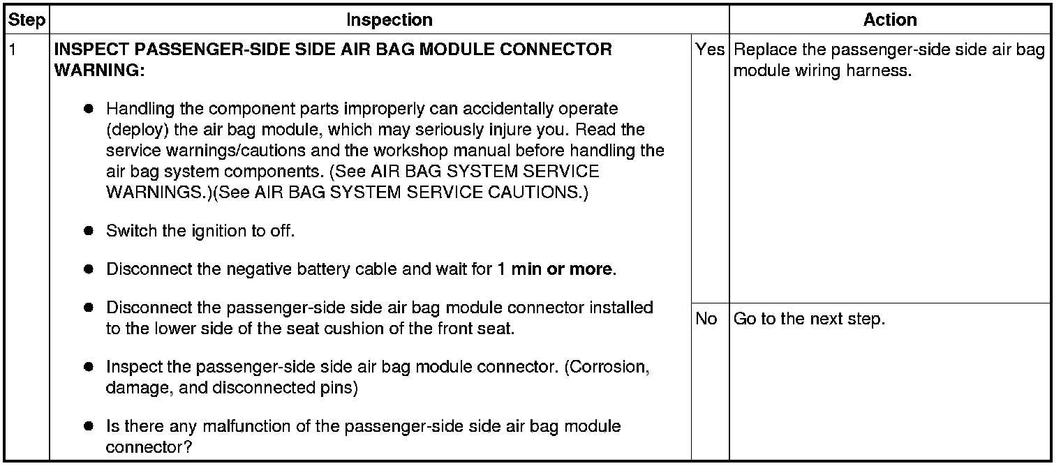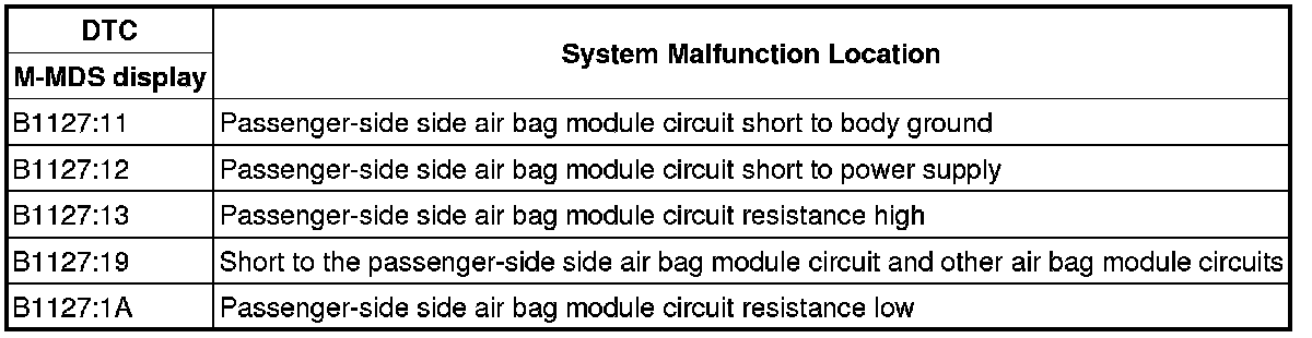 - Resistance other than 1.54-8.27 ohms detected in passenger-side side air bag module circuit