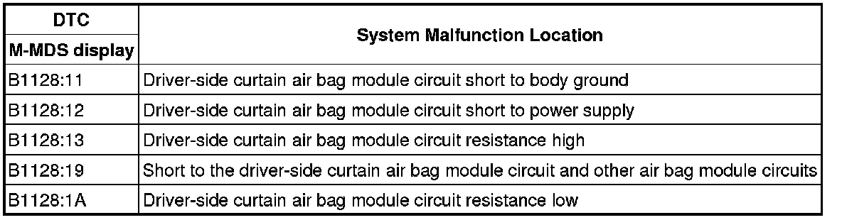 - Resistance other than 1.54-5.06 ohms detected in driver-side curtain air bag module circuit