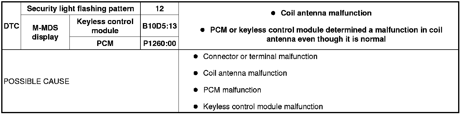 SECURITY LIGHT: 12, DTC: B10D5:13/P1260:00 [IMMOBILIZER SYSTEM (ADVANCED KEYLESS ENTRY AND PUSH BUTTON START SYSTEM)]