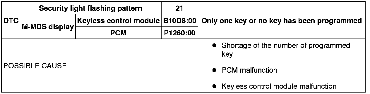 SECURITY LIGHT: 21, DTC: B10D8:00/P1260:00 [IMMOBILIZER SYSTEM (ADVANCED KEYLESS ENTRY AND PUSH BUTTON START SYSTEM)]