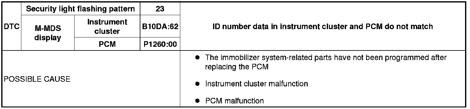 SECURITY LIGHT: 23, DTC: B10DA:62/P1260:00 [IMMOBILIZER SYSTEM (KEYLESS ENTRY SYSTEM)]