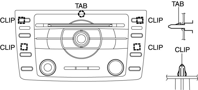 1. Pull the audio unit outward, detach tab, clip from the dashboard, and then remove the audio unit.
