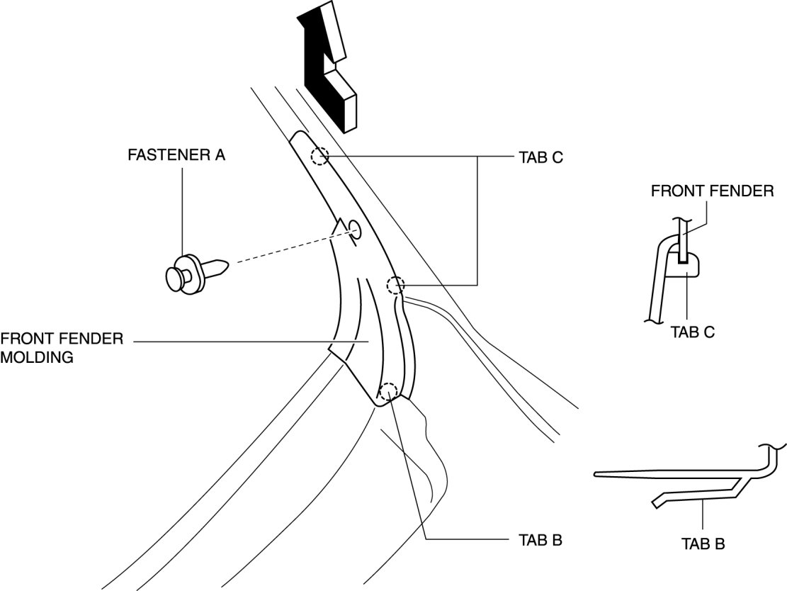 3. Pull the front fender molding in the direction of the arrow shown in the figure and remove it while remove the tab B and tab C.