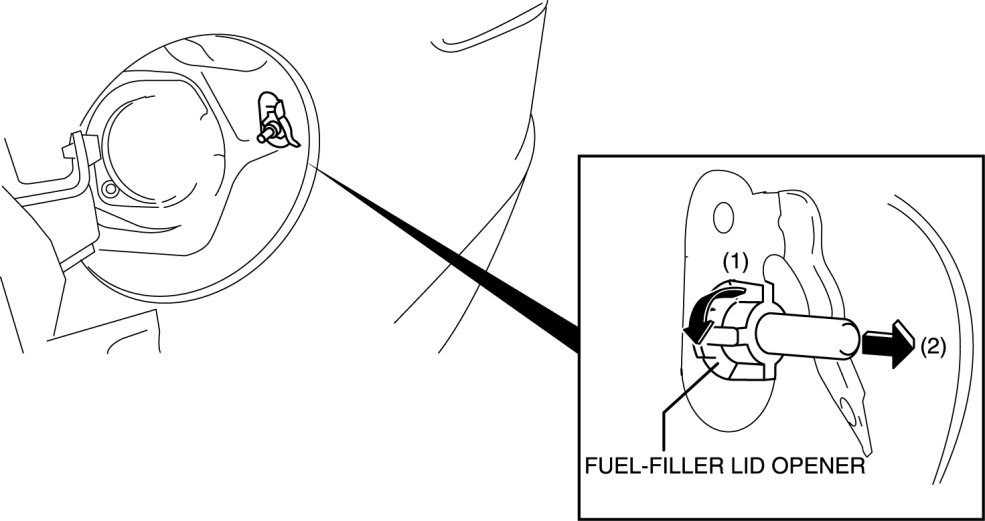 5. Rotate the fuel-filler lid opener in the direction of the arrow (1) as shown in the figure and pull it out in the direction of the arrow (2).