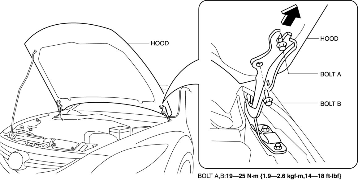 - Removing the hood without supporting it could cause the hood to fall and cause serious injury. Always perform the procedure with at least another person to prevent the hood from falling.