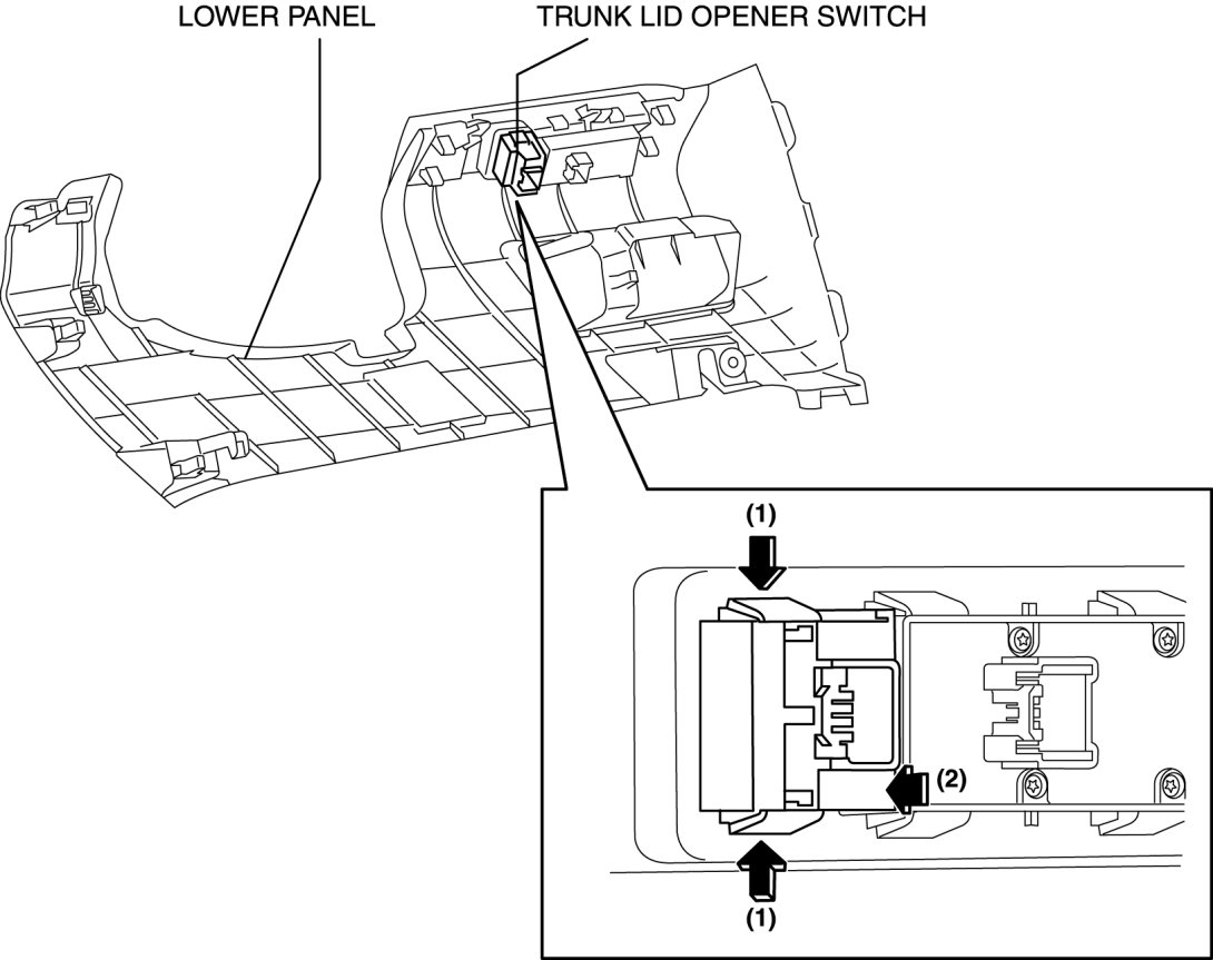 4. Remove the trunk lid opener switch in the direction of the arrow (2) shown in the figure while pressing the trunk lid opener switch tabs in the direction of the arrow (1).