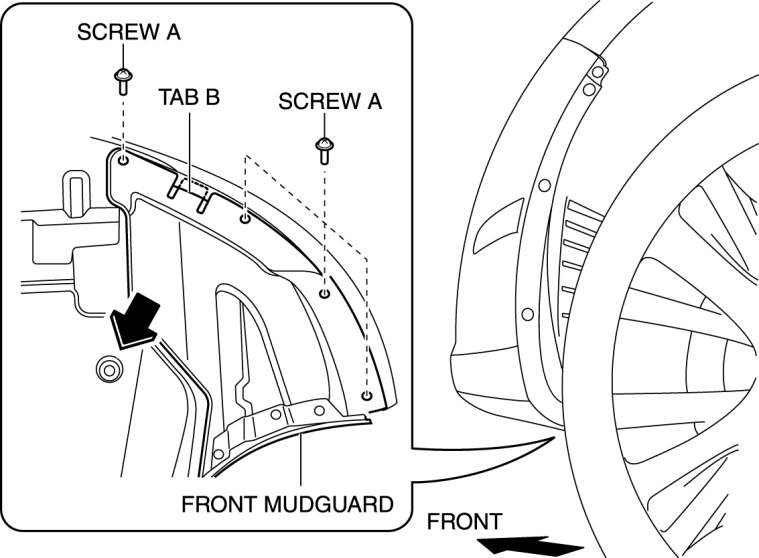 1. Remove screws A and tab B, and set the front mudguard out of the way in the direction of the arrow shown in the figure.