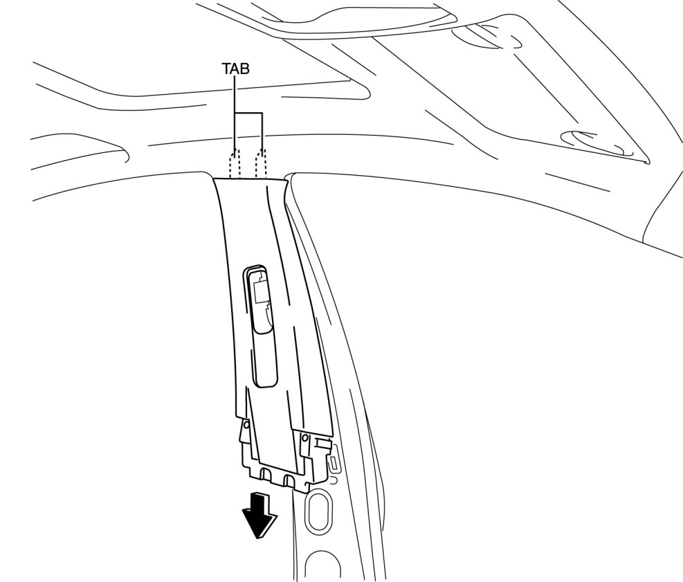 - When removing the B-pillar upper trim, be careful not to damage the tabs.