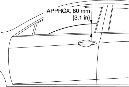 1. To access the glass installation bolt, position the front door glass so that the distance from the top of the front door glass to the upper part of the front beltline molding is approx. 80 mm {3.1 in}.