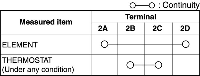 4. Verify that the continuity between the seat warmer terminals is as indicated in the table.
