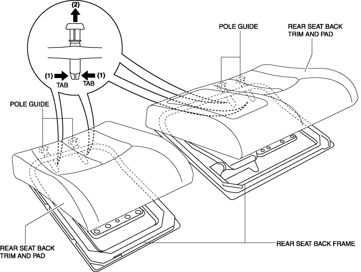 8. Peal back the rear seat back trim and pad, release the pole guide tabs in the direction of arrow (1) shown in the figure, then pull out the pole guides in the direction of arrow (2).