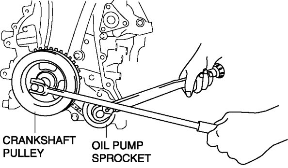 1. Temporarily install the crankshaft pulley and crankshaft pulley lock bolt to the crankshaft, and lock the oil pump against rotation as shown in figure.