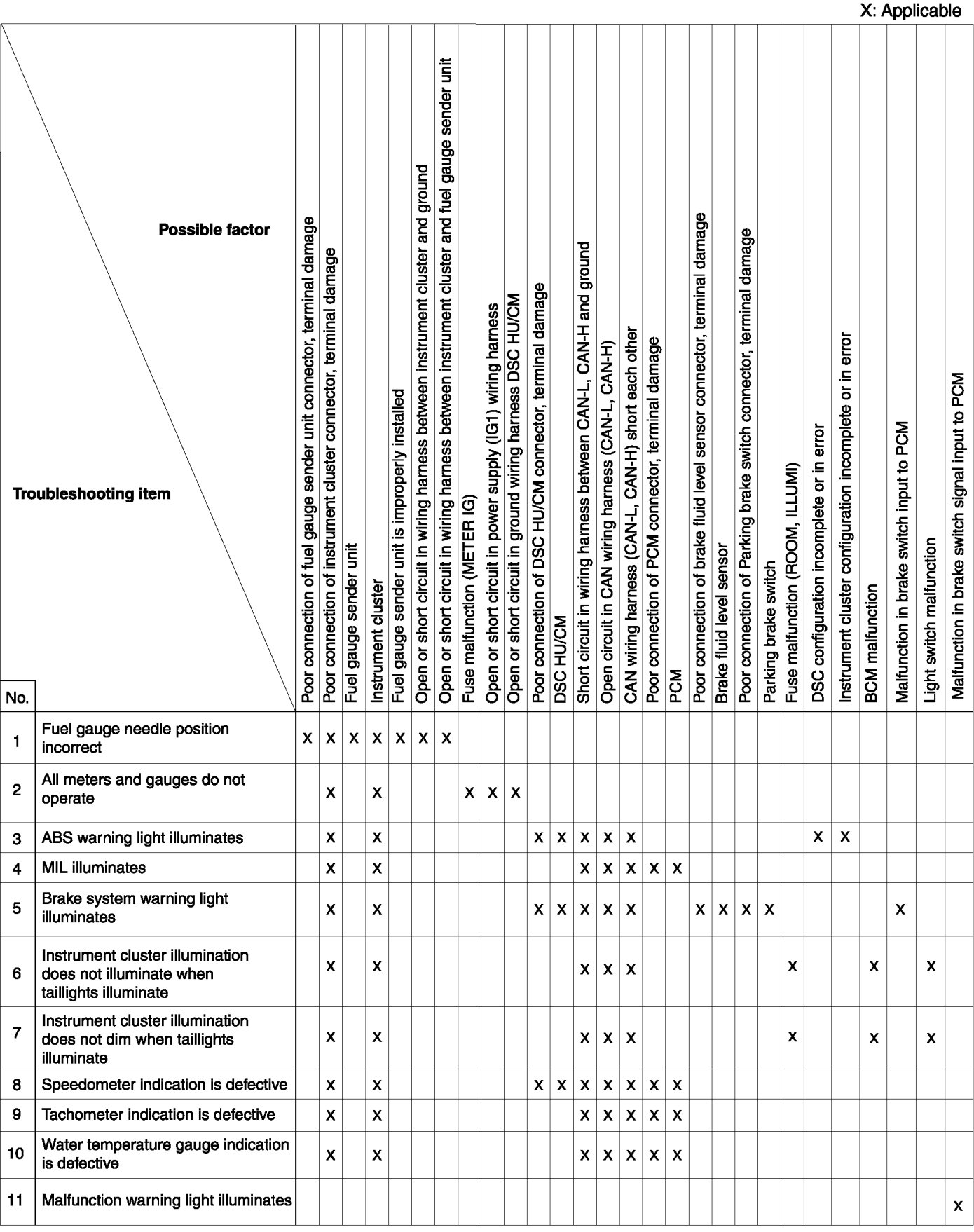 QUICK DIAGNOSTIC CHART [INSTRUMENT CLUSTER (WITH MALFUNCTION WARNING LIGHT)]