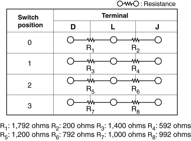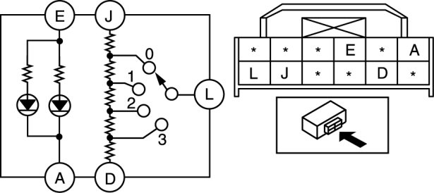 2. Verify that the resistance between the headlight leveling switch terminals is as indicated in the table.