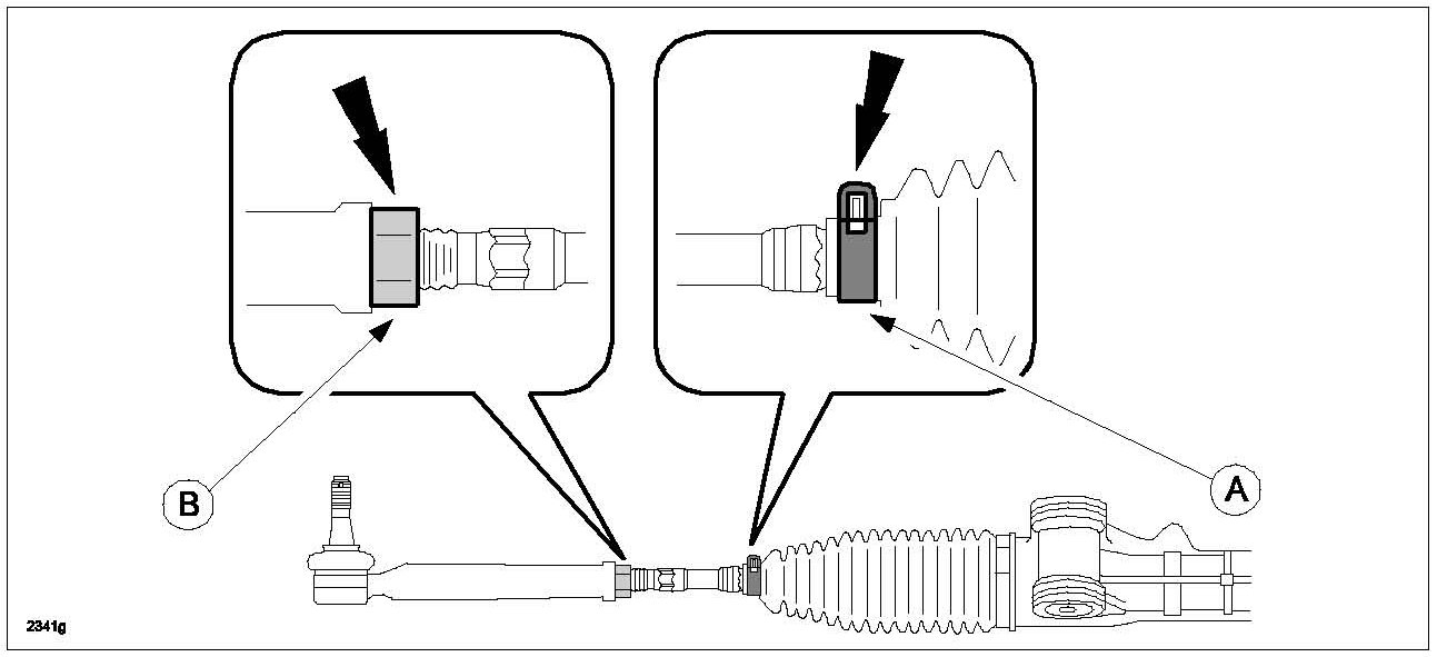 2. Remove the boot clamp (A), then loosen the lock nut (B).
