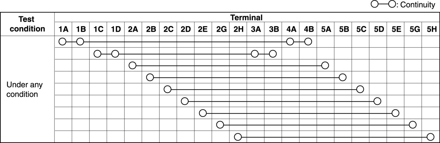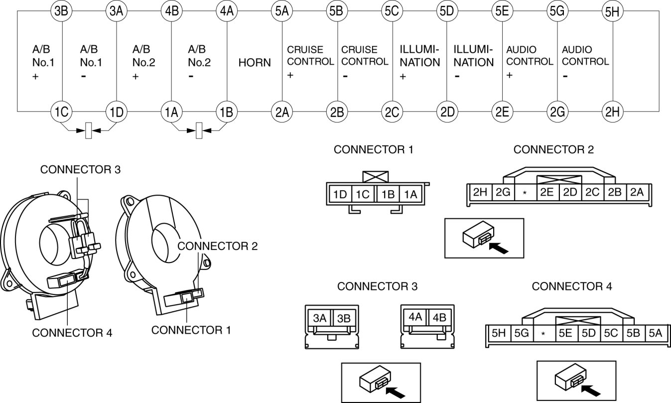 - When the vehicle-side connector for the clock spring is disconnected, terminals 1A, 1B, 1C and 1D are shorted to prevent unexpected operation (deployment) of the air bag module.