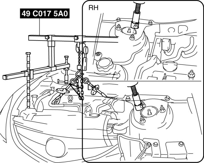 1. Adjust the SST (49 C017 5A0) and lean the engine toward the transaxle.