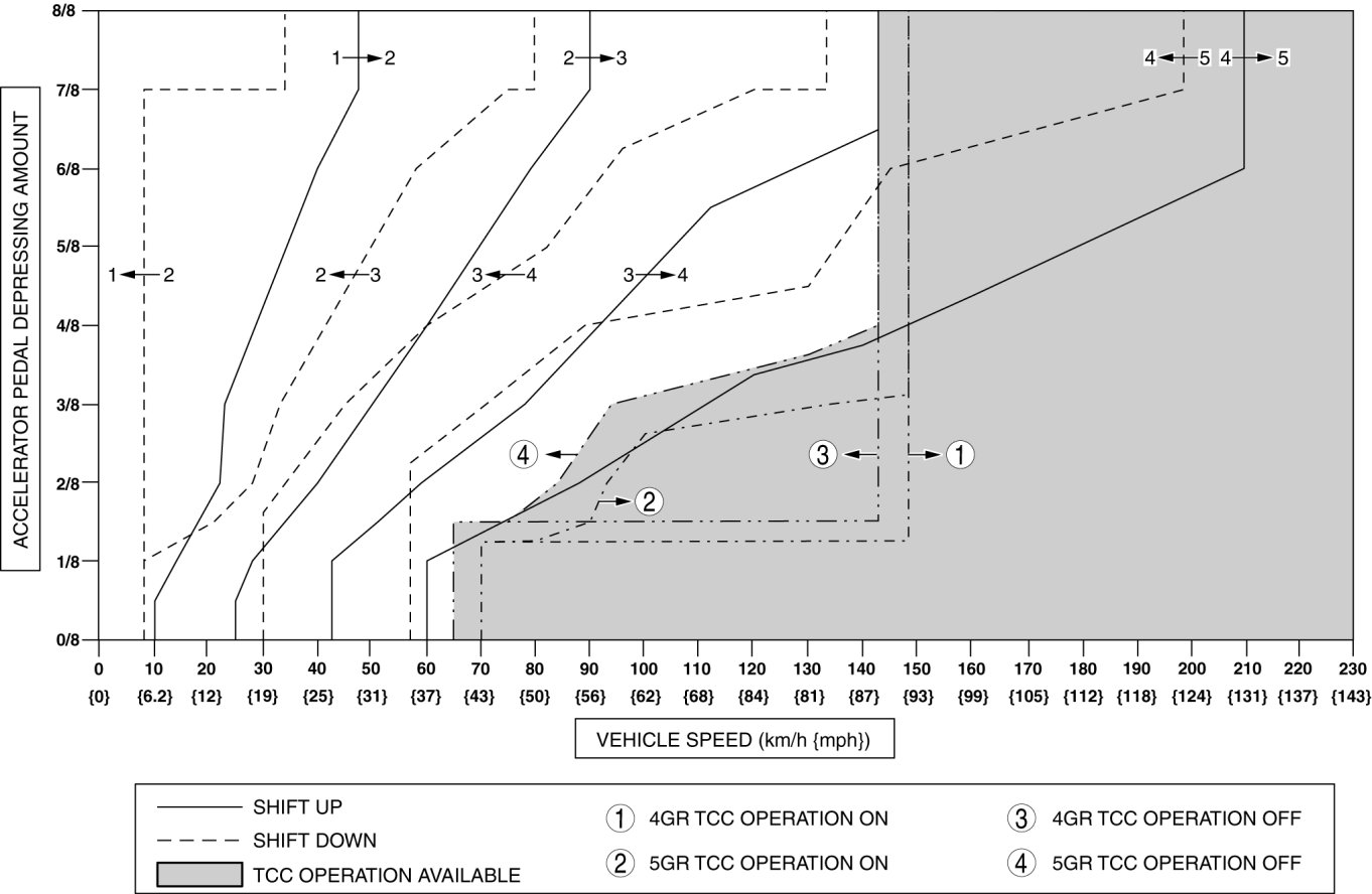 c. Verify that the gears shift from 5GR to 4GR, 4GR to 3GR, 3GR to 2GR, and 2GR to 1GR after kickdown while driving in 5GR, 4GR, 3GR, and 2GR. In addition, verify that the vehicle speed for kickdown corresponds to the shift point.