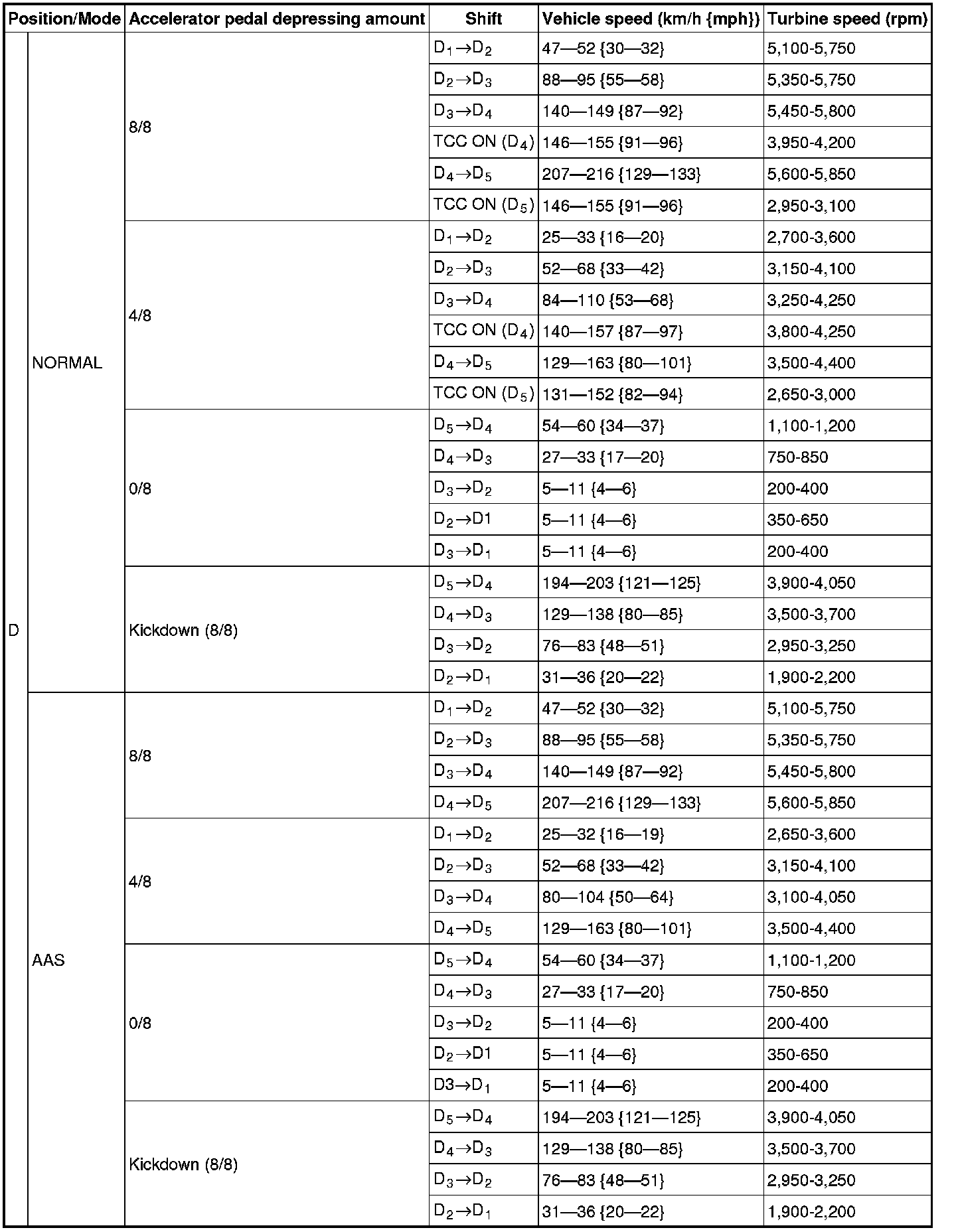 4. Inspect the shift point for the D position in normal mode.