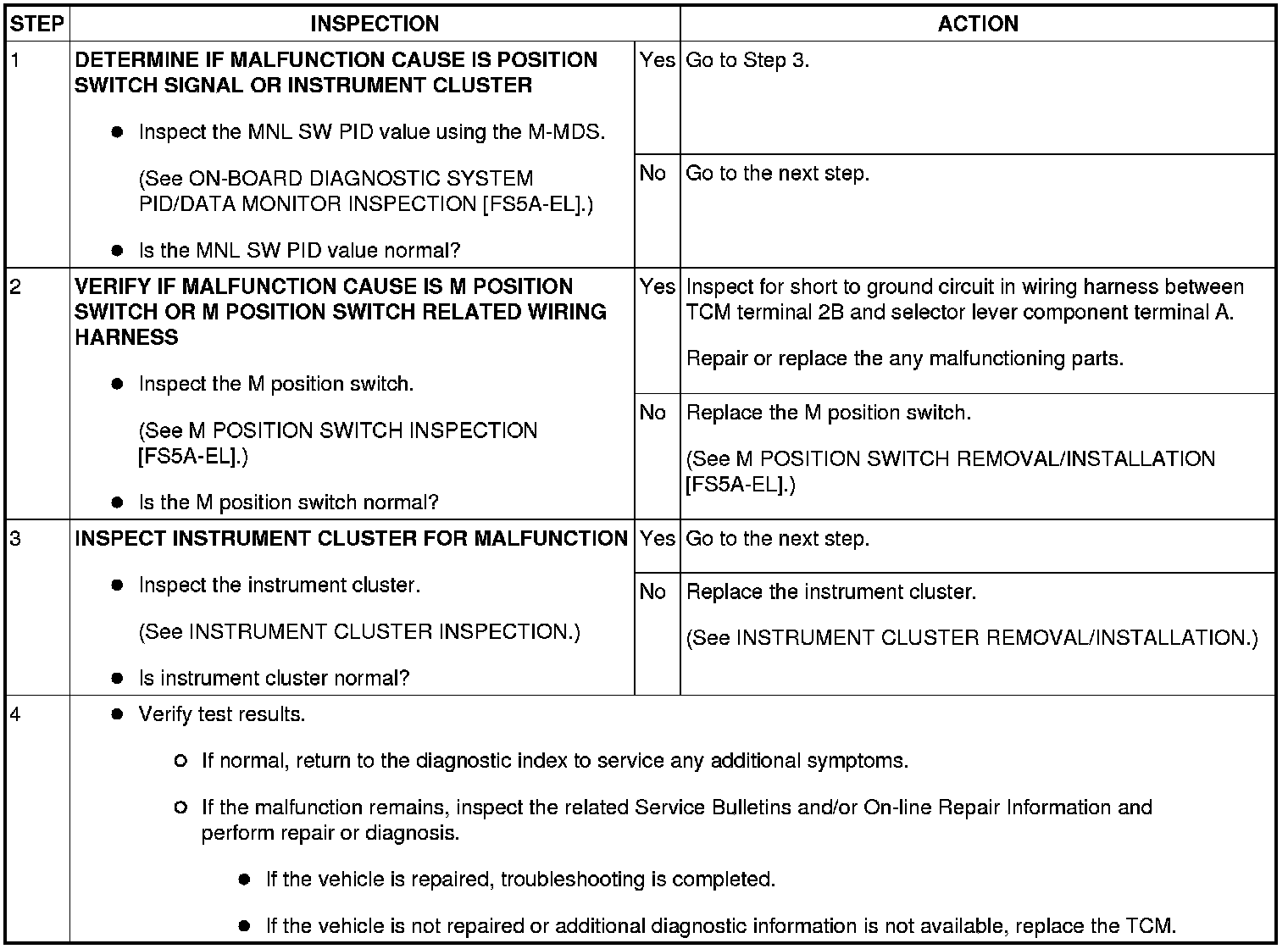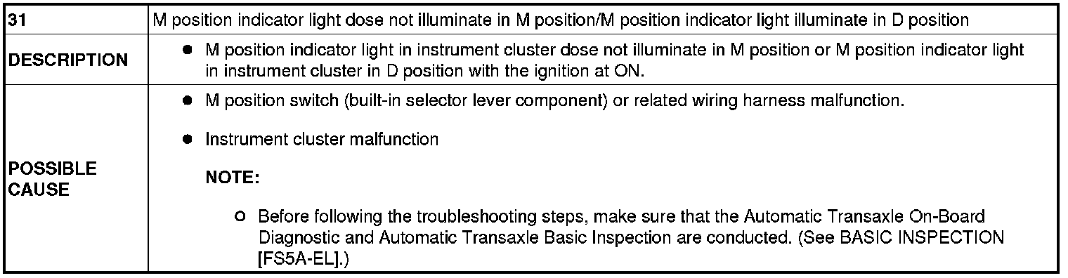 NO.31 M POSITION INDICATOR LIGHT DOES NOT ILLUMINATE IN M POSITION/M POSITION INDICATOR LIGHT ILLUMINATES IN D POSITION [FS5A-EL]