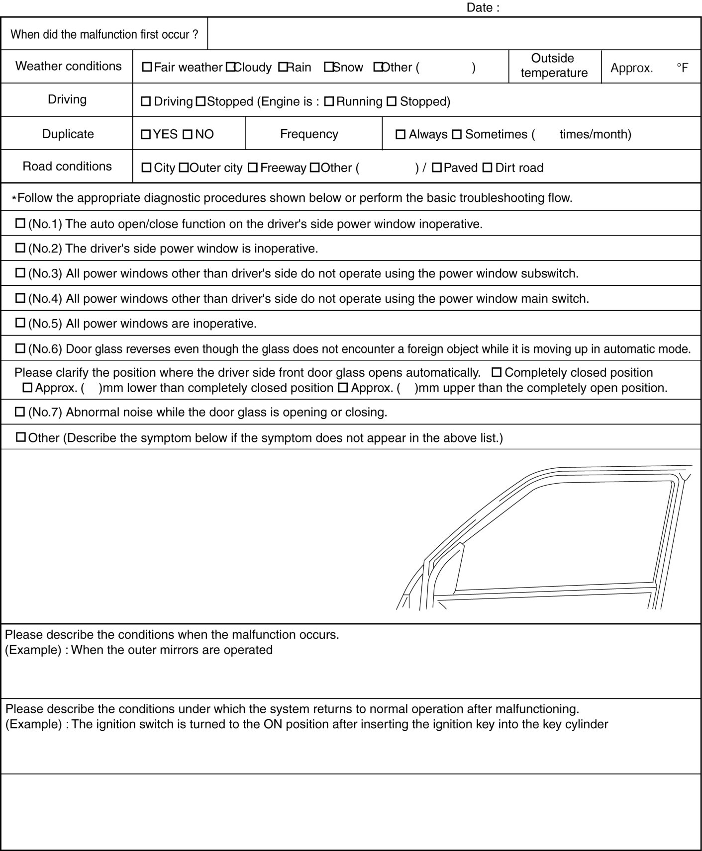POWER WINDOW SYSTEM TROUBLESHOOTING QUESTIONNAIRE [POWER WINDOW SYSTEMS (WITHOUT EXTERIOR OPEN FUNCTION)]
