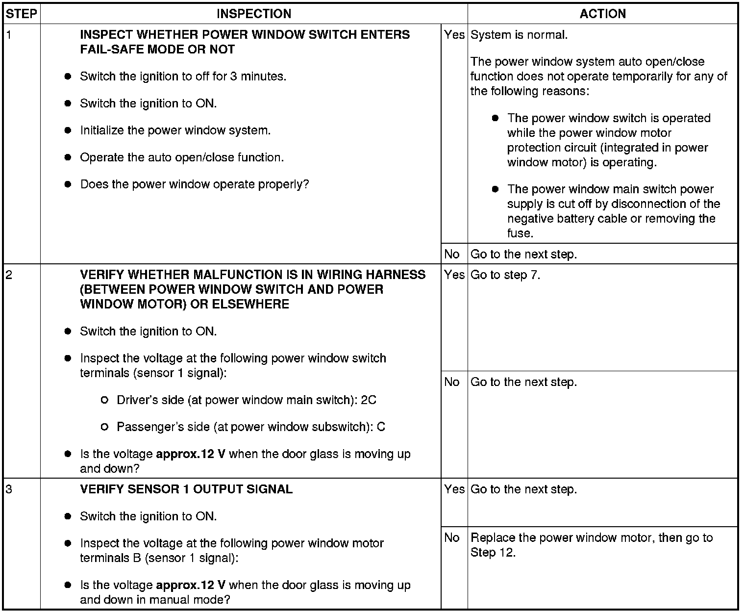 - Perform the following inspection for the power window system component parts of windows where the door glass cannot be operated automatically.