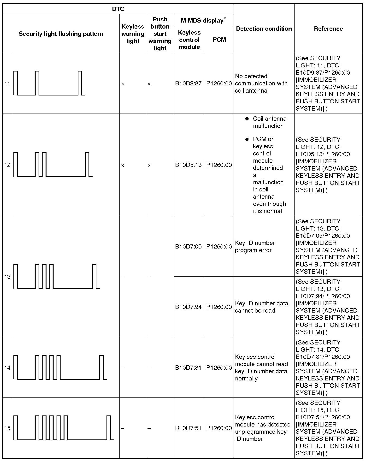 - DTC 21 or higher: Illuminates for approx. 1 min and the DTC flash pattern indicated in the table below repeats 10 times.