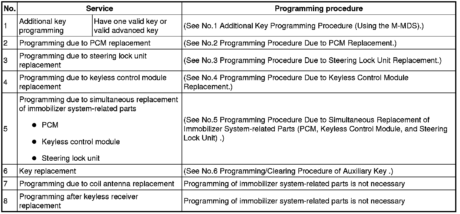 Immobilizer System-Related Parts Service and Programming Procedure Table