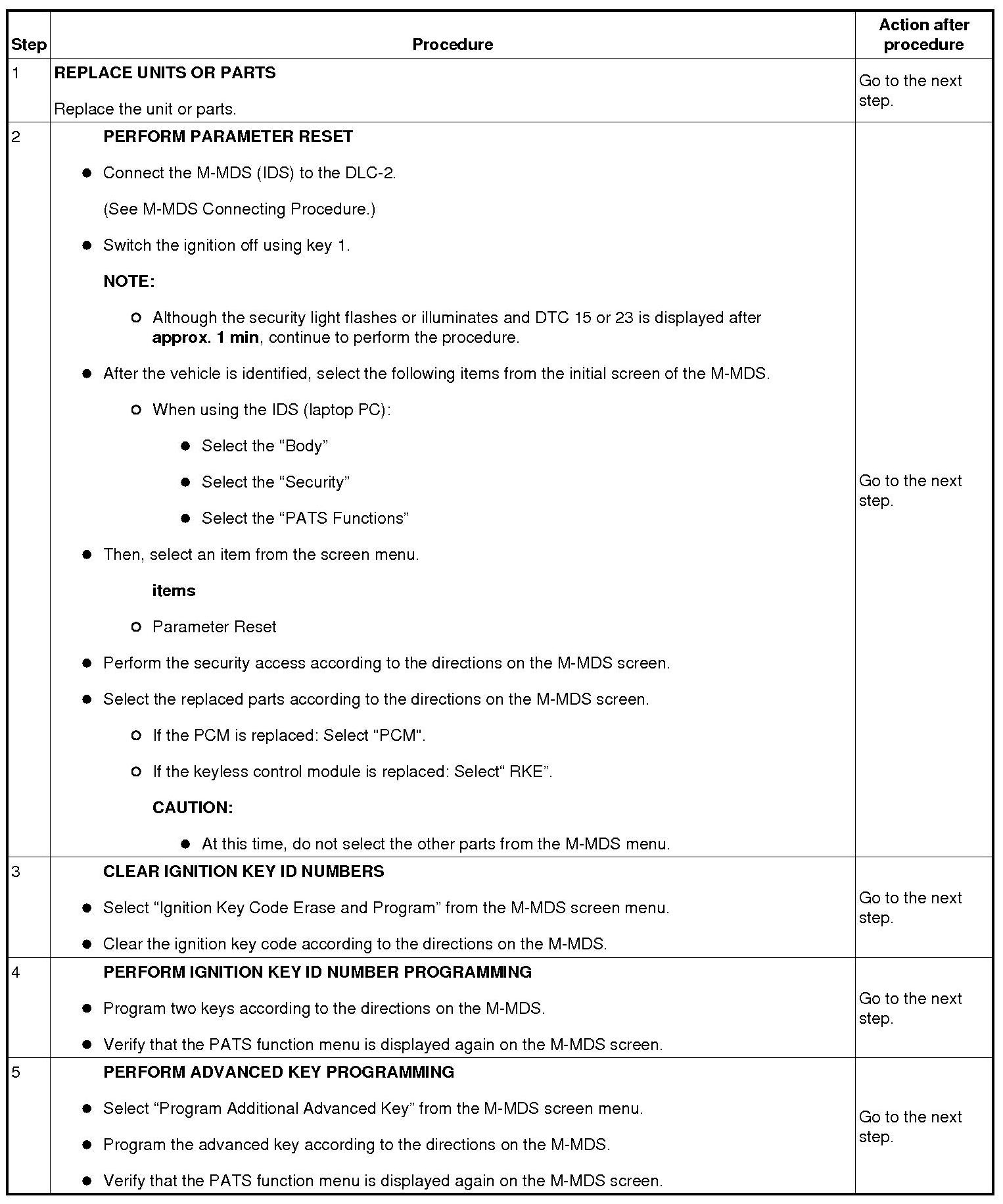 - When replacing the keyless control module or the steering lock, remove the valid keys or valid advanced keys from the vehicle (keep them 1 m or more from the vehicle) and switch the ignition on according to the directions on the M-MDS screen. Select, "There is no programmed ignition key and programmed advanced key" from the M-MDS screen.