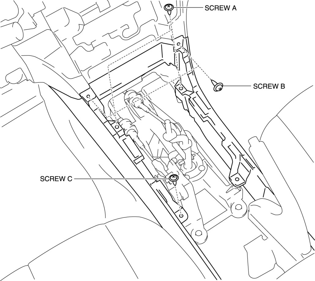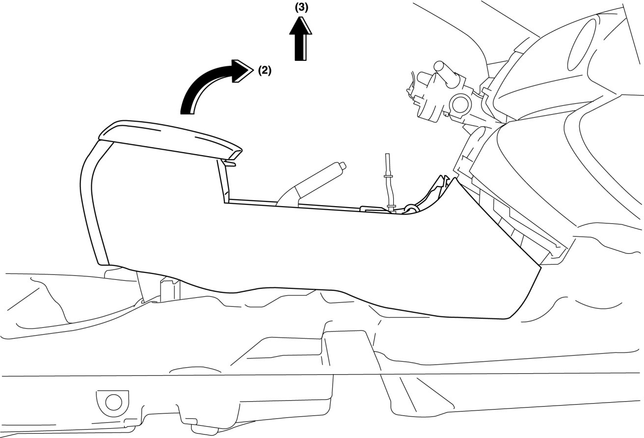 12. Pull up the rear console in the direction of the arrow (2) shown in the figure, move the rear console in the direction of the arrow (3), and remove it avoiding the parking brake lever.