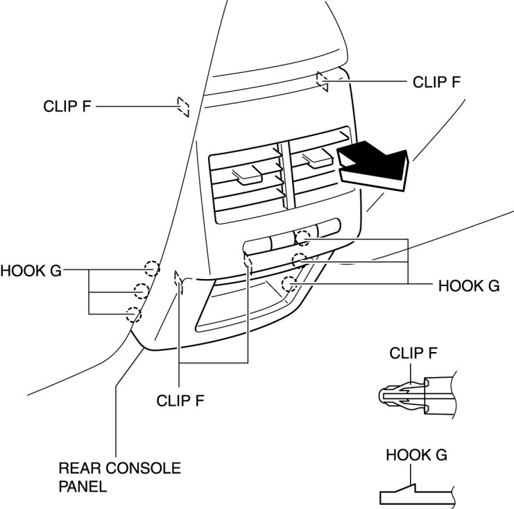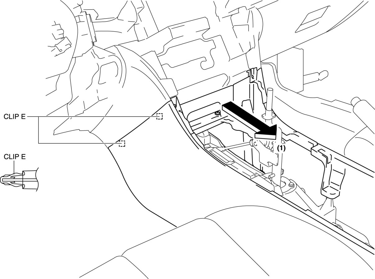 11. Pull the rear console in the direction of the arrow in the order of (1), then detaching clip E.