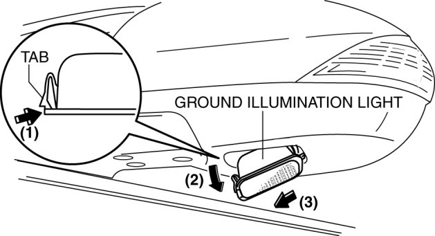 3. While pressing tab in the direction of the arrow (1), pull the ground illumination light in the direction of the arrow (2).