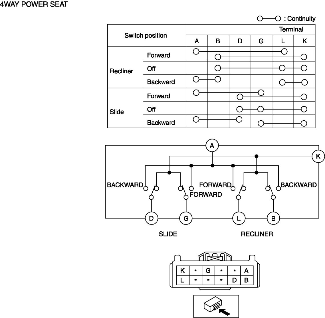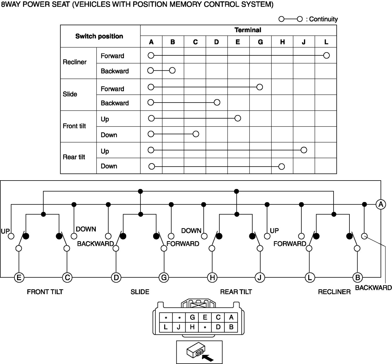 2. Inspect for continuity between the power seat switch connector terminals using an ohmmeter.