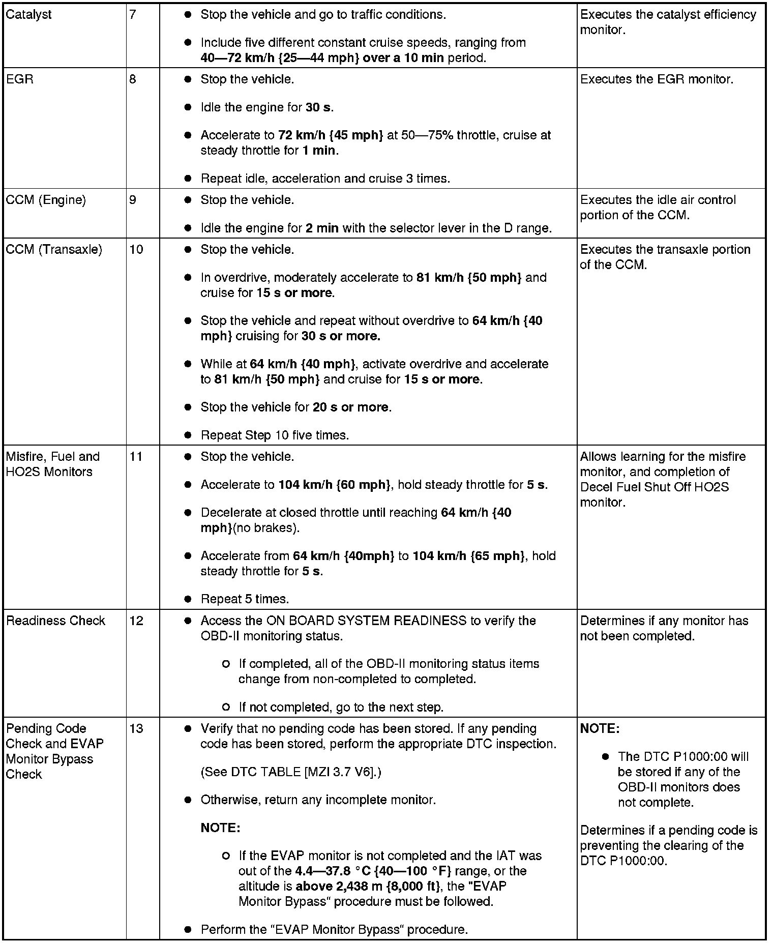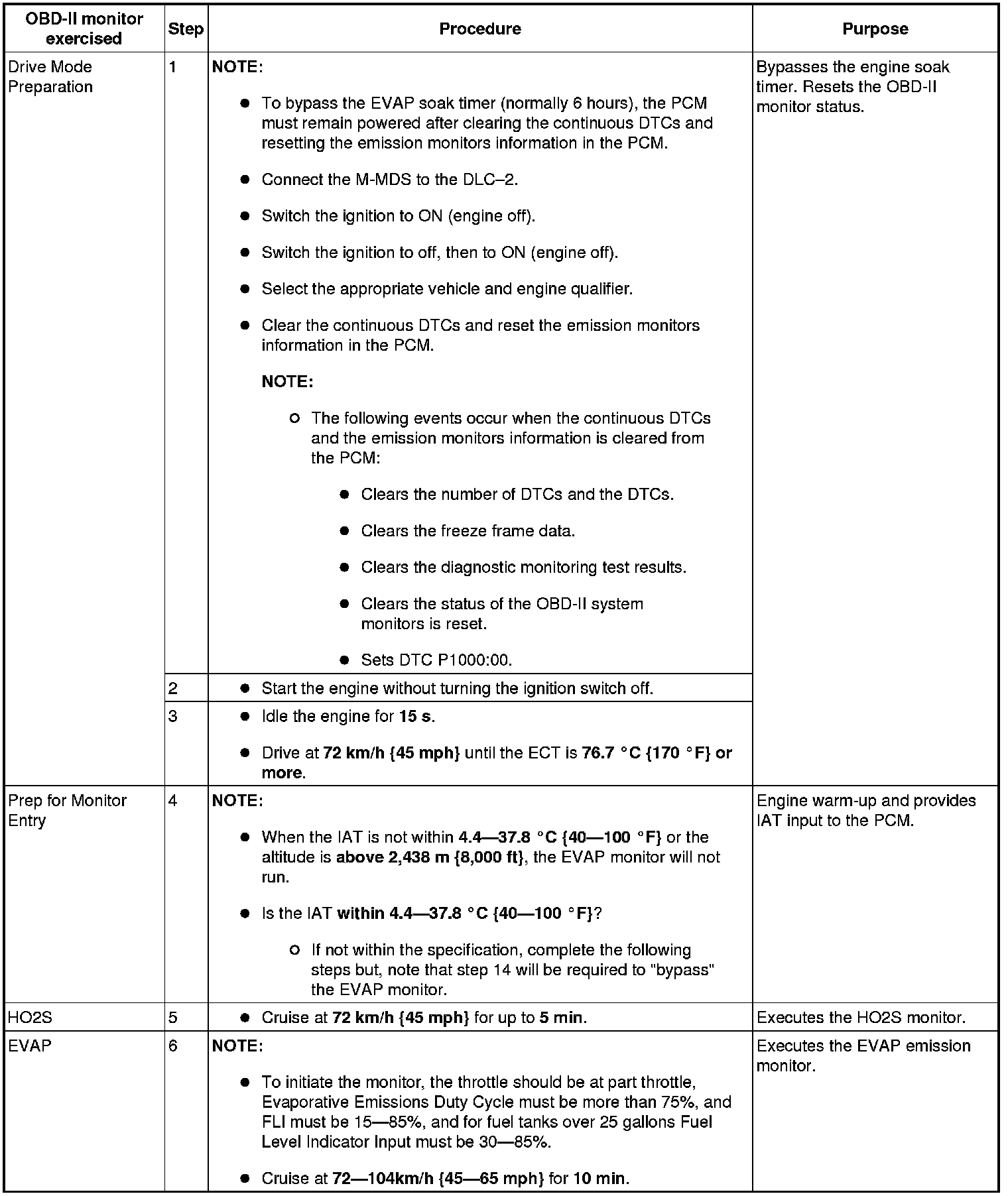 - The following procedure is designed to execute and complete the OBD-II monitors and to clear the Ford P1000:00, inspection/maintenance (I/M) readiness code. To complete a specific monitor for repair verification, follow steps 1 through 4, then continue with the step described by the appropriate monitor found under the OBD Monitor Exercised column. For the EVAP monitor to run, the ambient air temperature must be between 4.4-37.8 °C {40-100 °F}, and the altitude below 2,438 m {7,999 ft}. If the P1000:00 code must be cleared in these conditions, the PCM must detect them once (twice on some applications) before the EVAP monitor can be bypassed and DTC P1000:00 is cleared. The EVAP bypassing procedure is described in the following drive cycle.