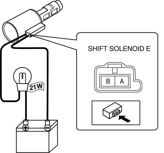 1. Connect the positive battery terminal to terminal B of shift solenoid E via the 12-21 W bulb and connect the negative battery terminal to terminal A of shift solenoid E.