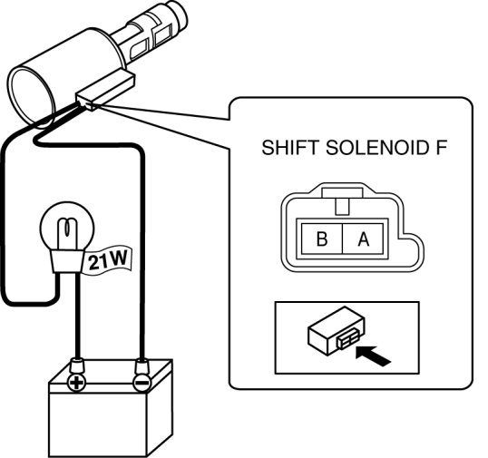 1. Connect the positive battery terminal to terminal B of shift solenoid F via the 12-21 W bulb and connect the negative battery terminal to terminal A of shift solenoid F.