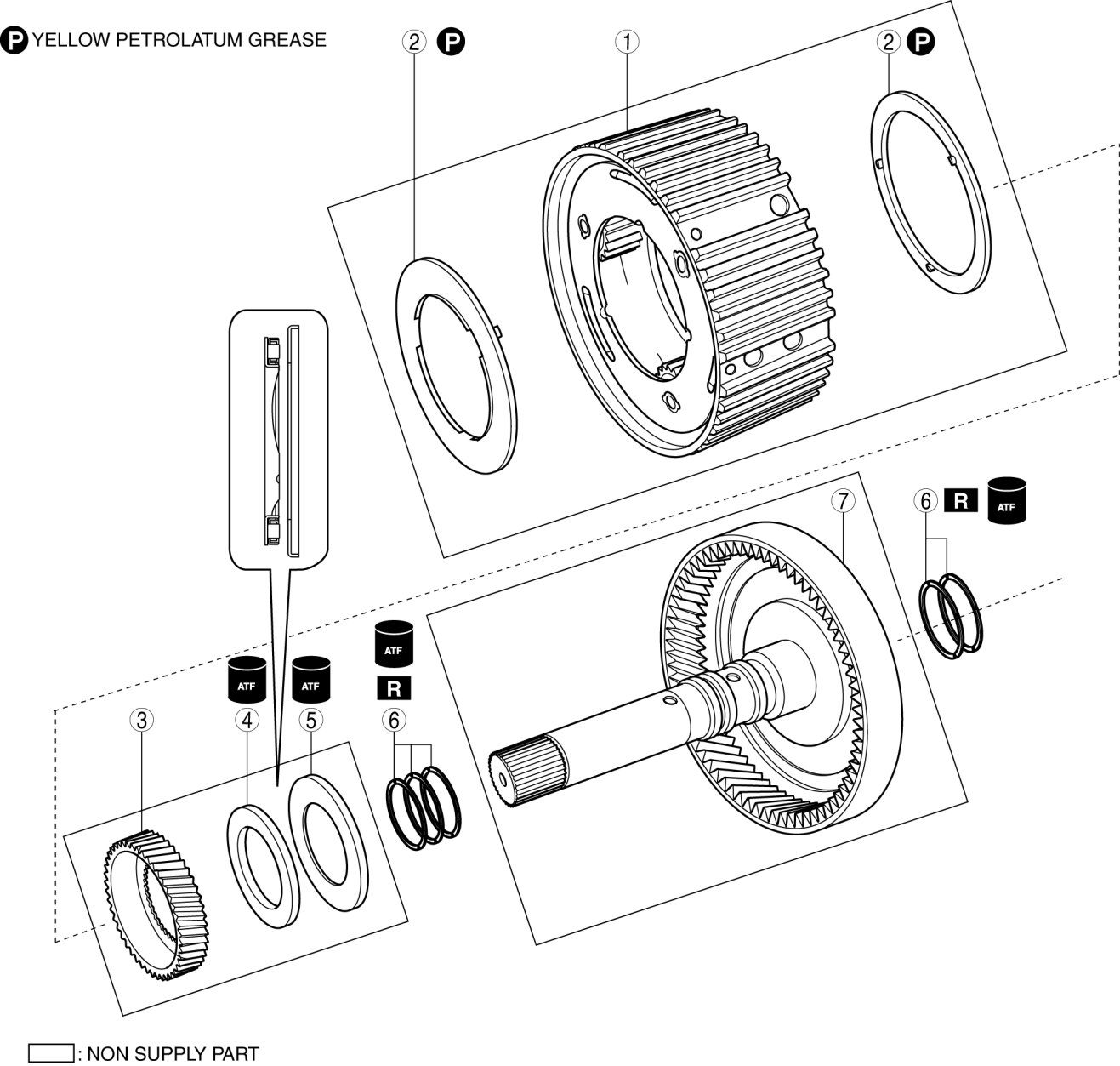 - Apply yellow petrolatum grease to the mounting surface of the thrust washer so that it does not drop when the front planetary gear component is installed.