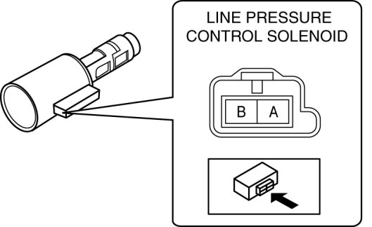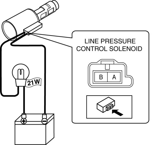 1. Connect the positive battery terminal to terminal B of line pressure control solenoid via the 12-21 W bulb and connect the negative battery terminal to terminal A of line pressure control solenoid.