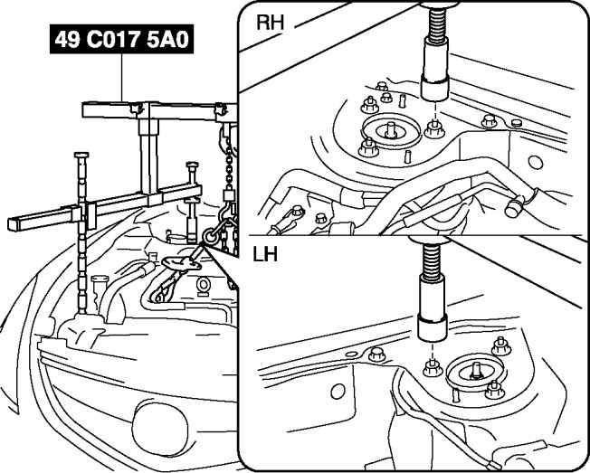 c. As shown in the figure, set the rear shafts of the SST to the left and right shock absorber nuts.