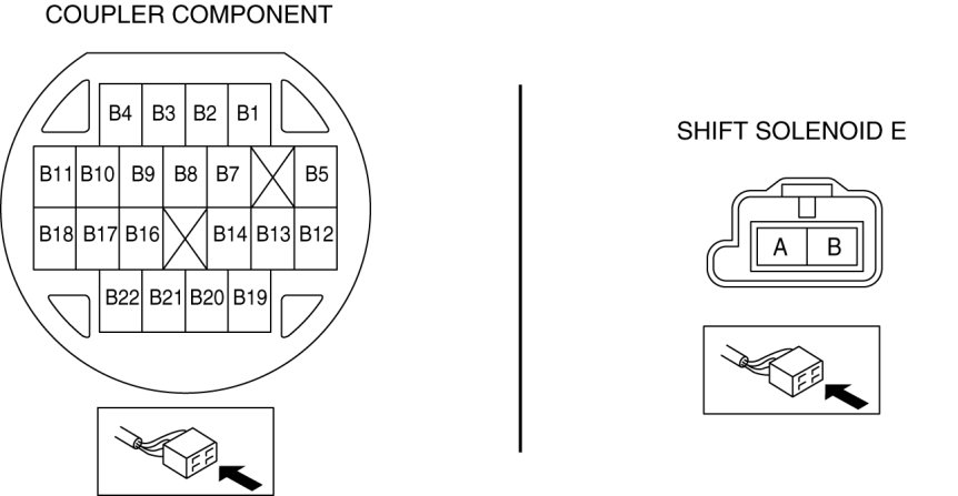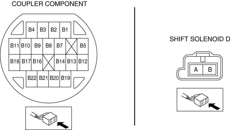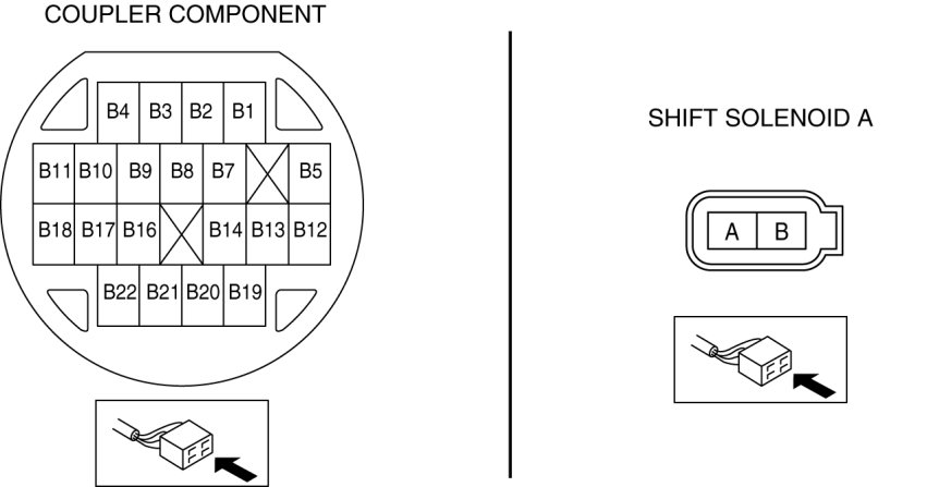 - Measure the continuity between coupler component terminal B5 and shift solenoid A terminal B.