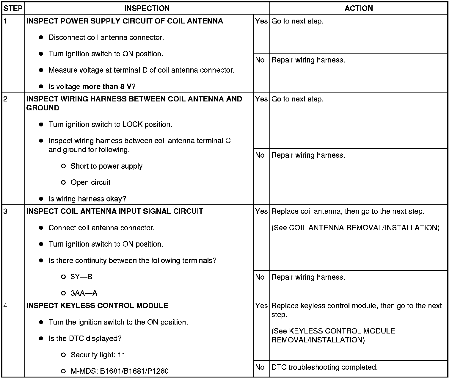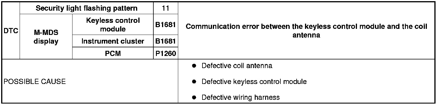 SECURITY LIGHT 11, DTC B1681 / B1681 / P1260 [IMMOBILIZER SYSTEM (ADVANCED KEYLESS AND START SYSTEM)]