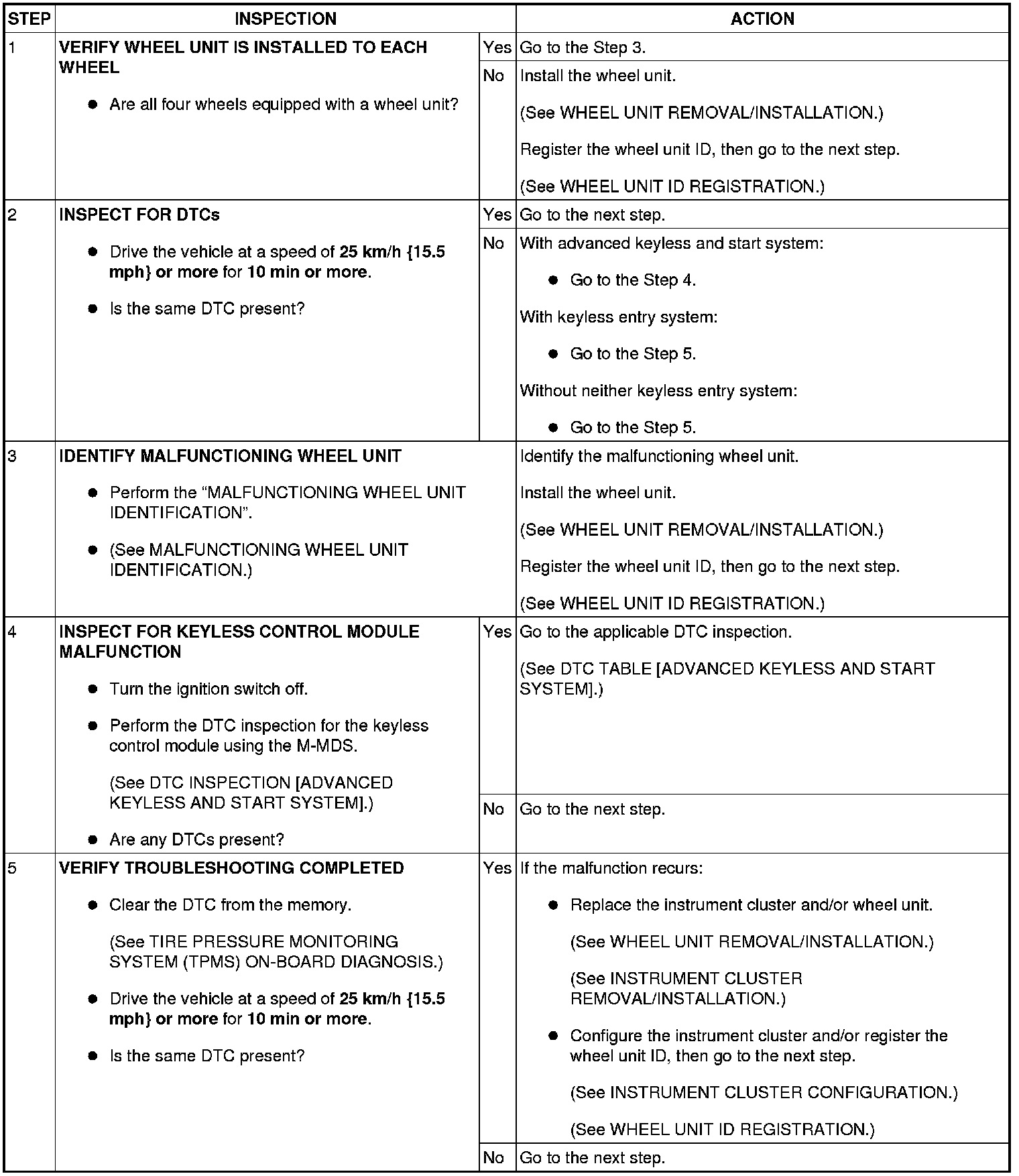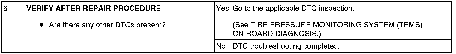 - If the wheel unit has been newly replaced, the TPMS warning light may flashes before the ID registration is complete, and DTC U2616, U2617, U2618 and U2619 may be stored in the memory. In this case, re-implement the wheel unit ID registration, and after confirming that the TPMS warning light is no longer flashing, erase the DTC. If the TPMS warning light does not go out, a malfunction on any one of the wheel units may have occurred and the ID registration will not have been correctly performed. Repeat the diagnostic procedure from Step 1 and perform and inspection.